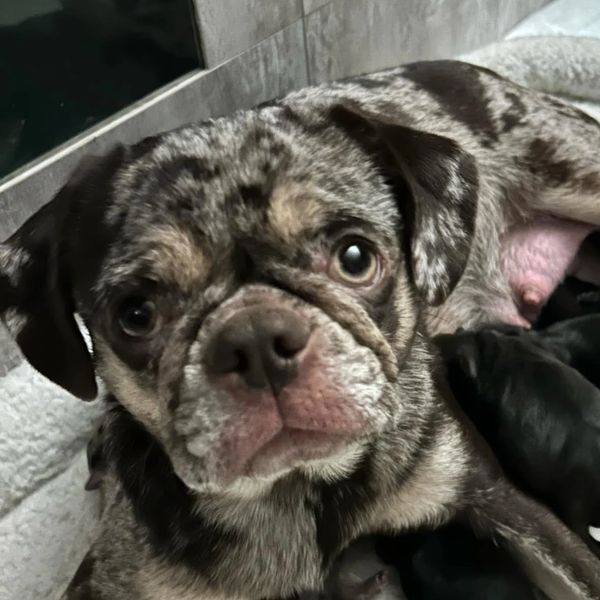 Prune is our stunning Chocolate Merle Dam with tan points, and she brings both beauty and personality to our breeding program at Superior Pugs. With her vibrant coat and lively spirit, Prune is impossible to miss and even harder not to love.