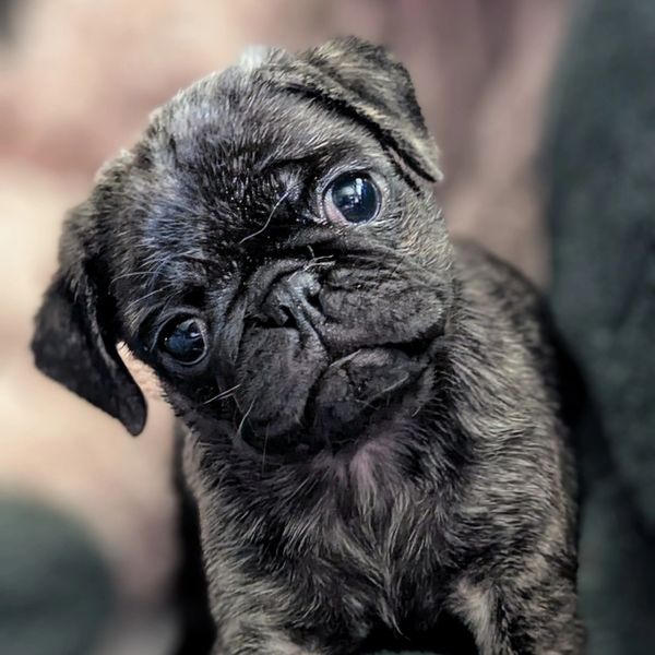 Raisin is still growing into her personality, but already shows signs of the sweet temperament, curiosity, and charm we love to see in a pug. She’s affectionate, eager to please, and full of that signature pug sparkle that keeps us smiling.